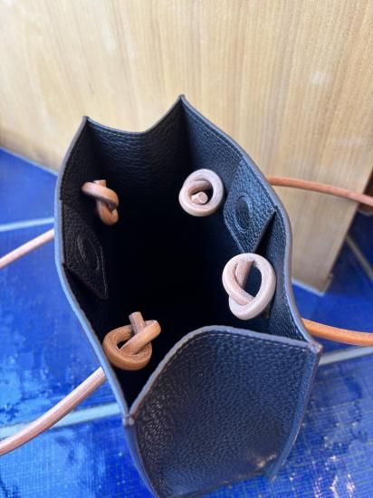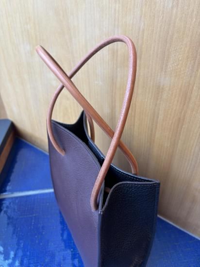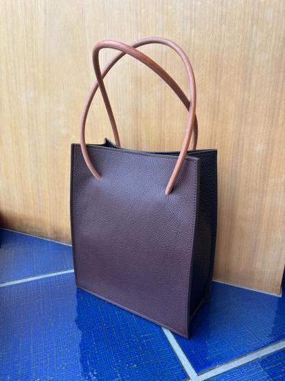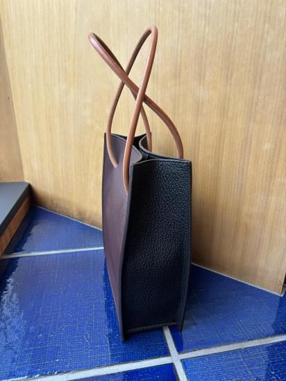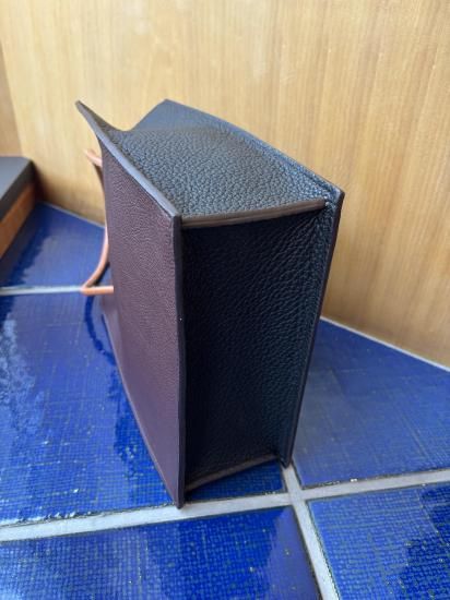 ザソールの名品リベロは紙袋のショッパーを高級レザーで作成しました。持ち手の丸紐は9mmのレザーを別注しています。トリヨンモーリスのバーガンディ&ブラックの配色は他店には無いです。横22.5cm縦26.8cmマチ9cm