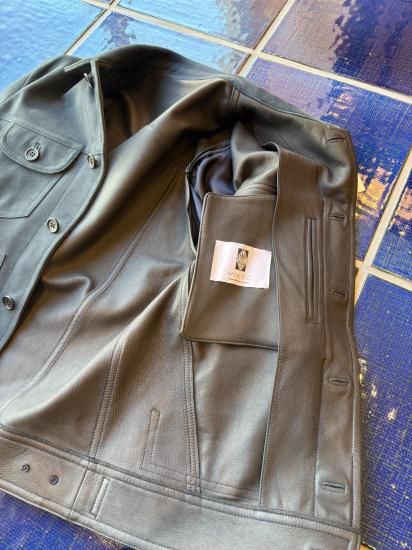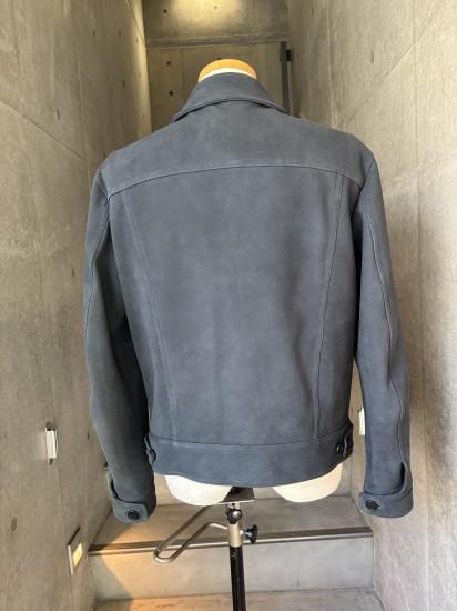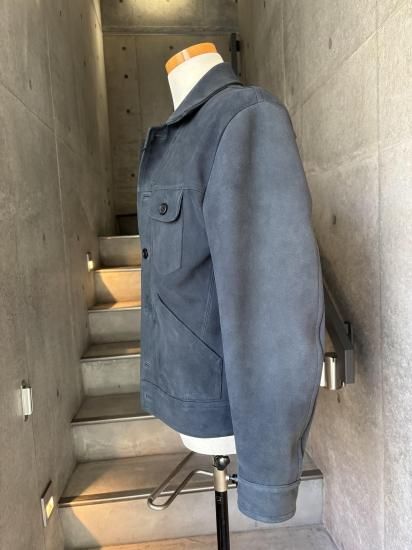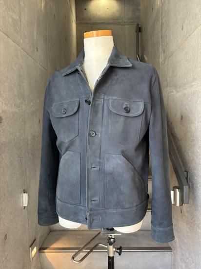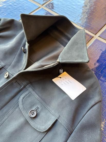 モレックの銀面付きスェードのGジャン型トラックジャケットです。通常スウェード素材は両面とも削って薄く仕上げる物が多い中、銀面付きで厚みのあるモッチリとした質感は珍しいです。裏が表側ですので滑りが良いのとダブルフェイスのような縫製で凄く綺麗です。