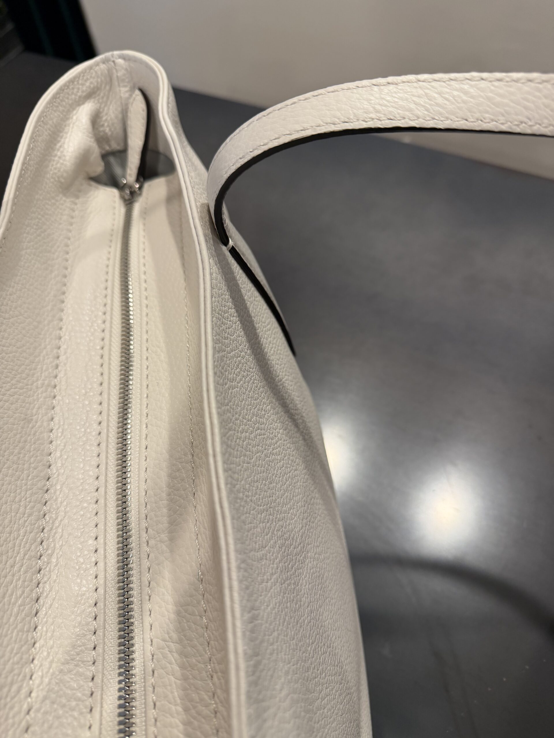 お手入れもしやすい、汚れの付きにくいシボ革のホワイトカラーにしてます。