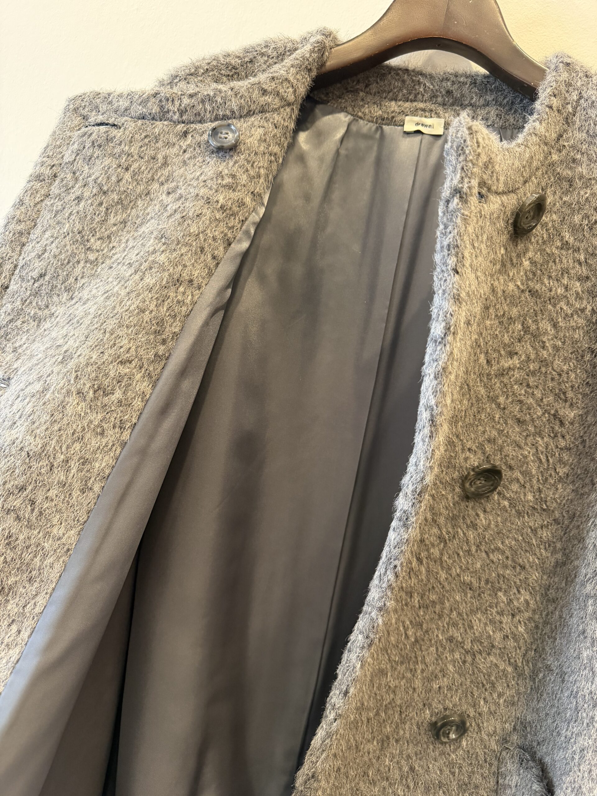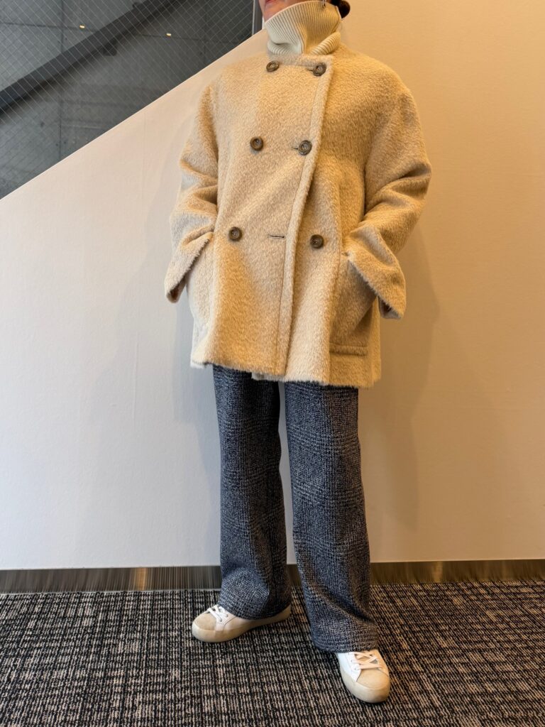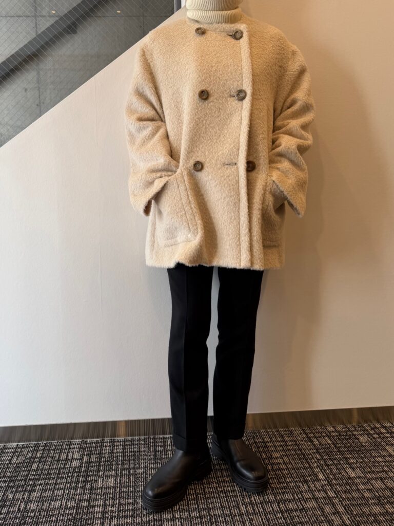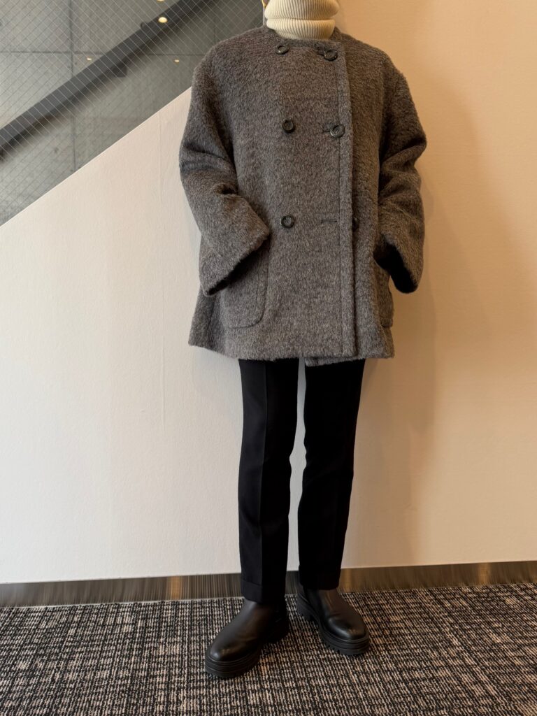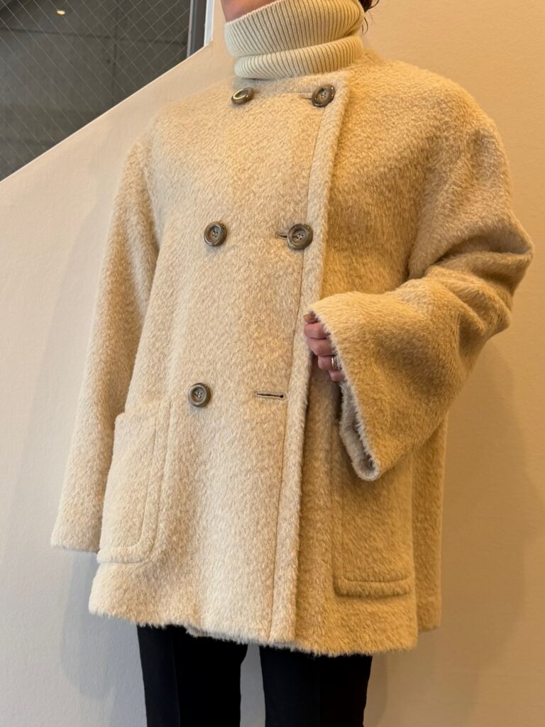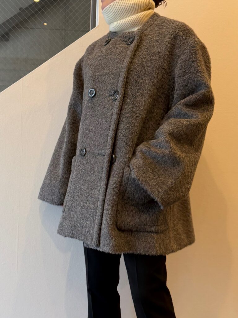 お尻が隠れるハーフ丈で、非常に使いやすい着丈なのと、軽いのでお出かけに手が伸びやすくなるウールアウターです✨