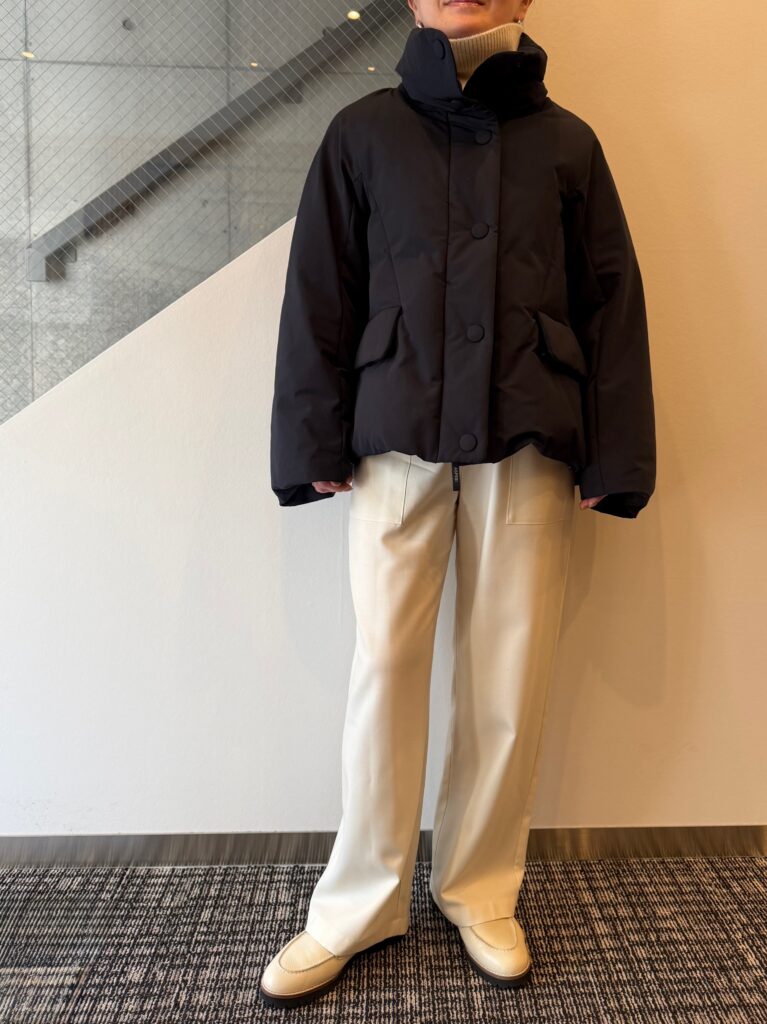 コンパクトなAラインシルエットで、太めのパンツからスカートまでバランスよく使えそうな一枚でした。